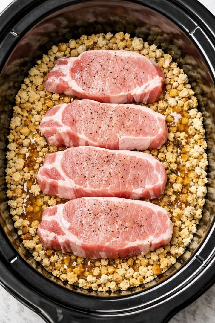 4-Ingredient Slow Cooker Pork Stuffing-Bed Chops