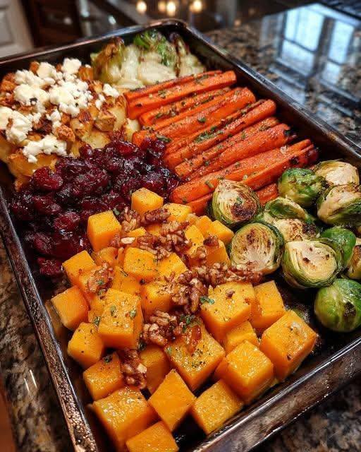 Here’s a holiday-ready roasted vegetable dish with sweet, tangy, and savory flavors—perfect as a side or centerpiece 🥕🍠🥦