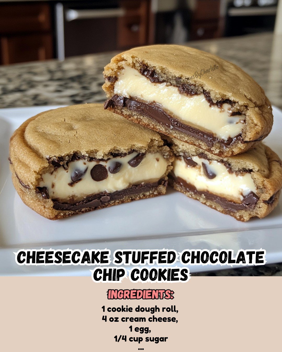 Here’s a fun, indulgent dessert recipe—Cheesecake-Stuffed Chocolate Chip Cookies. You get soft, chewy cookies with a creamy cheesecake center in every bite.