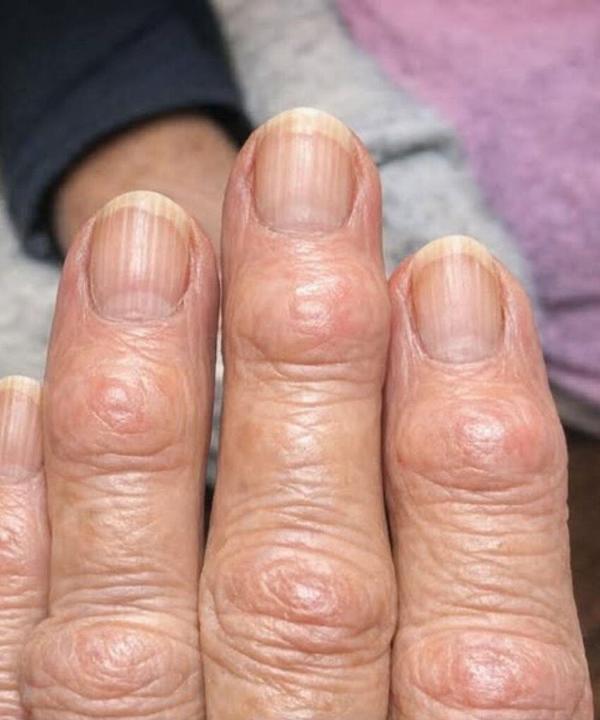 - Appearance: Hard, sometimes painful bumps at the tips of fingers near the nails.