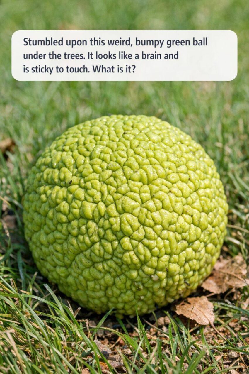 That strange, sticky green “brain ball” under the tree is almost certainly an Osage orange fruit—odd looking but harmless.