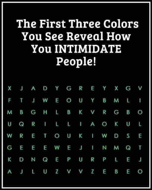 Ah, this sounds like one of those personality quizzes that tie color perception to social behavior. The idea is that the first three colors you notice in an image can supposedly reveal subtle aspects of how you project yourself, especially in terms of intimidation or presence. Here’s a general breakdown often used in these kinds of tests: